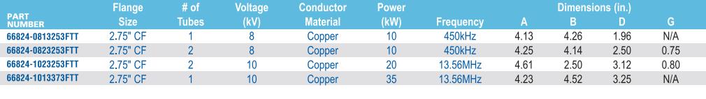 当并排安装两个 35kW/13.56MHz 射频馈通时,它们的中心距必须大于 2.00 英寸。必须在贯通件周围硬件之间留出足够的间隙,以避免功率耦合。