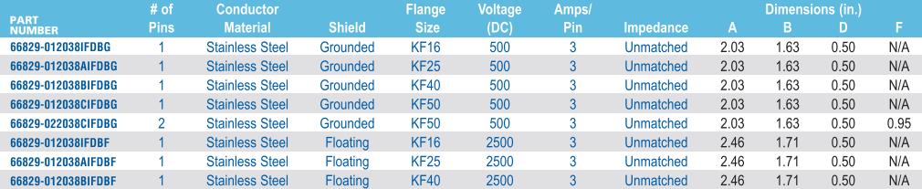 It is designed for the signal transmission of vacuum equipment and instruments. Voltage (V): 500; 2500 Current (A): 3 Maximum heating rate: 25°C per minute Cable connector temperature range: -65°C to 165°C Number of conductors: Optional 1 or 2 Conductor material: Stainless steel Impedance: 48 - 52 ohms Flange installation: KF16, KF25, KF40, KF50 Insulator material: Alumina Both 2D and 3D models are available. Non-standard customization is accepted. If you have any requirements, you can consult our sales engineers. Remarks: The marked technical parameters are subject to various conditions, such as material properties, mechanical design, and operating environment. All electrical ratings are based on the operation with one side in a dry atmospheric environment and the other side in a vacuum environment with a pressure of less than 1 x 10⁻⁴ Torr. All 3D models and any dimensions shown or listed in our catalog do not include manufacturing tolerances and are for reference only.