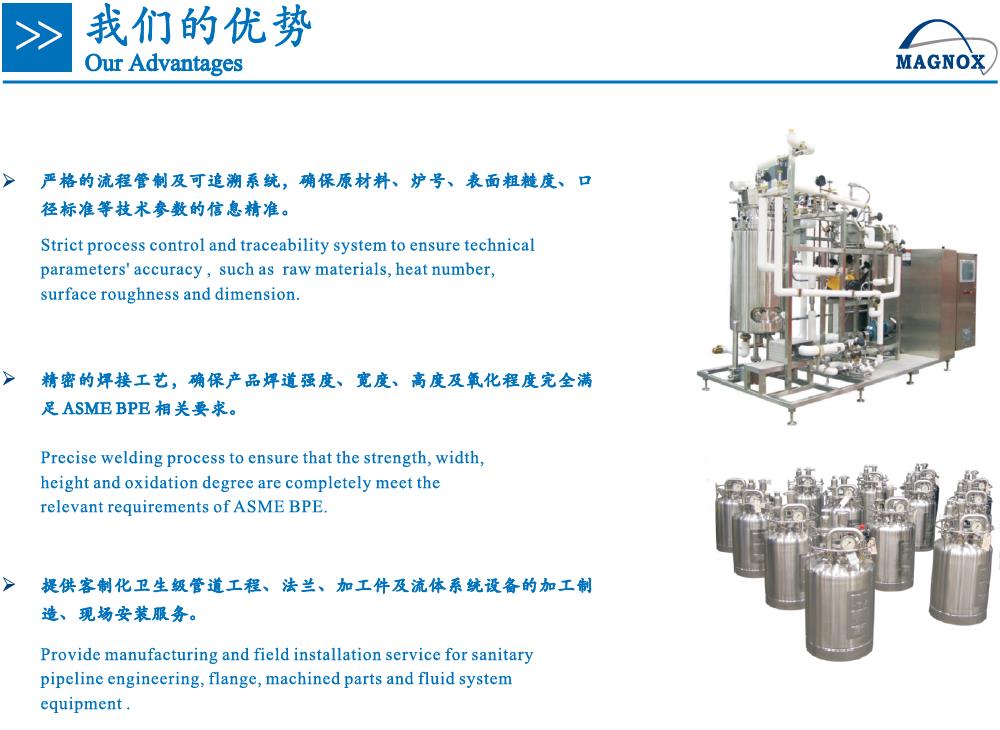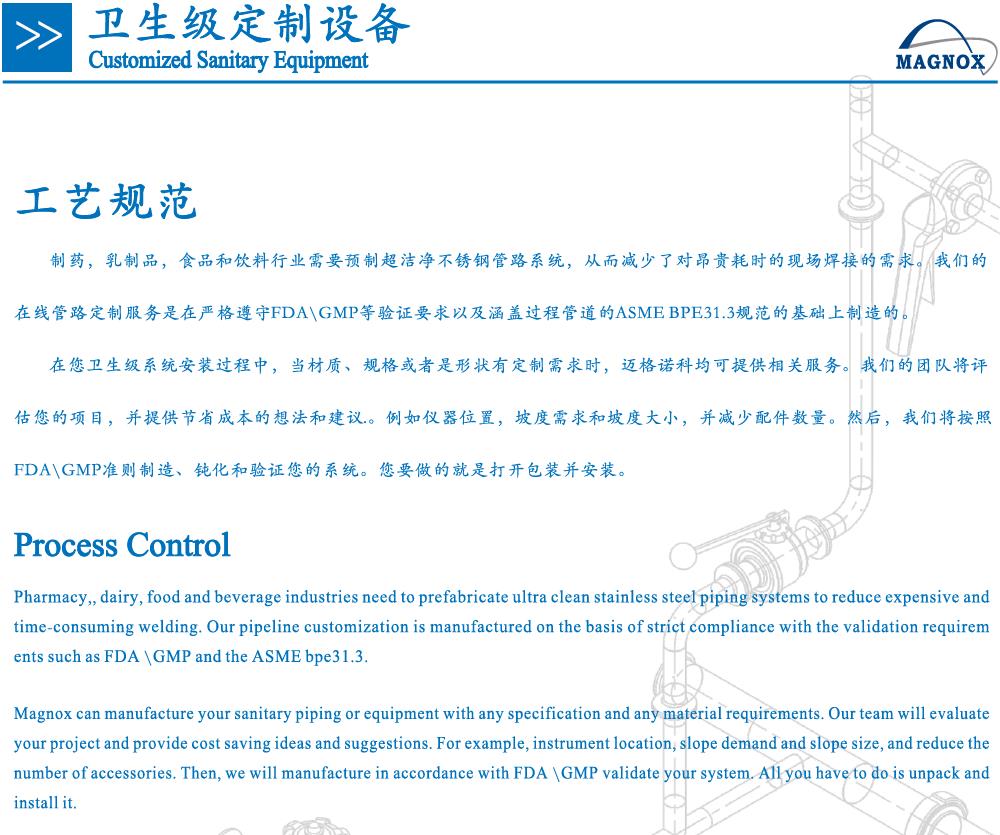 制药、乳制品、食品及饮料等产业需要预制不锈钢超洁净不锈钢管路系统,从而减少了对昂贵耗时的现场焊接的需求。我们的在线管路定制服务是严格遵守FDA\GMP等验证规范要求的基础上加工制造的。